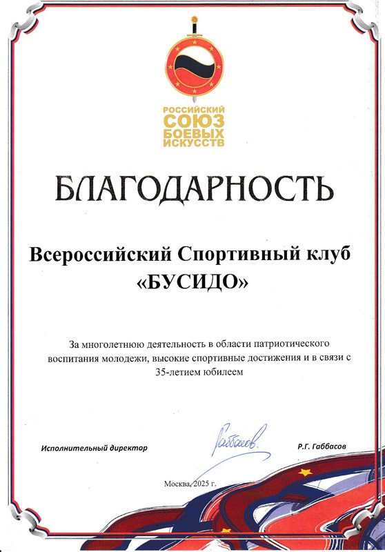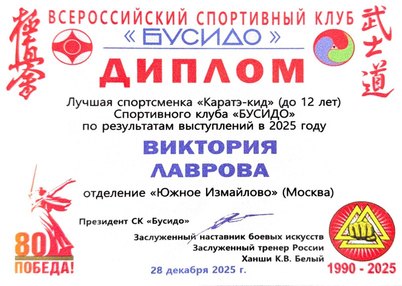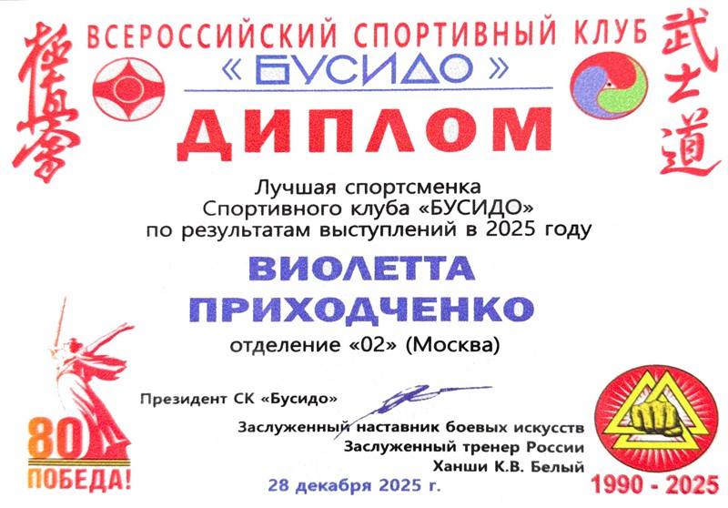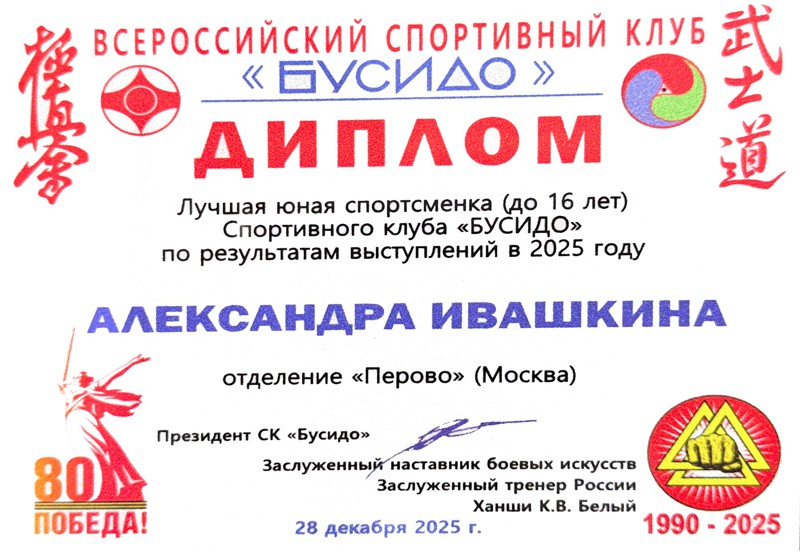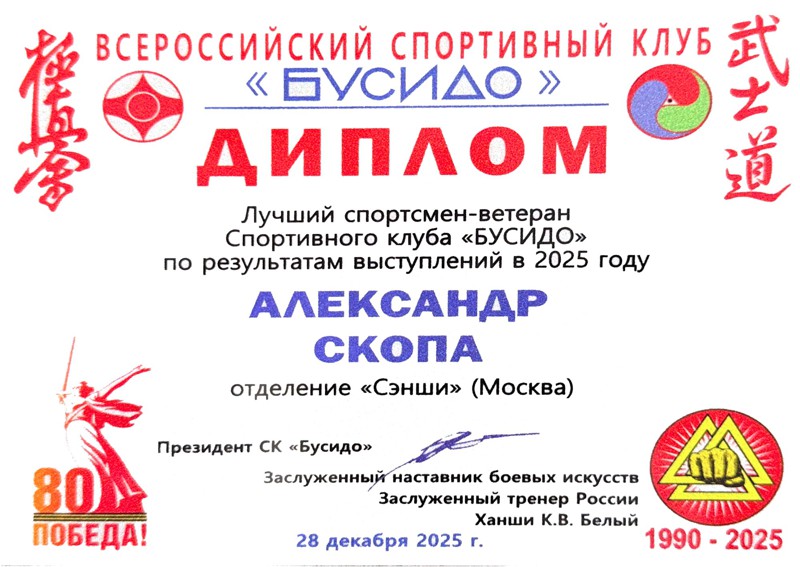 В рамках 24-го Всероссийского фестиваля киокусинкай "Юный мастер" на Кубок ДОСААФ России, прошедшего 28 декабря 2025 года в МЦБИ, состоялось награждение лучших спортсменов и тренеров клуба по итогам 2025 года и в связи с 35-летием основания клуба.