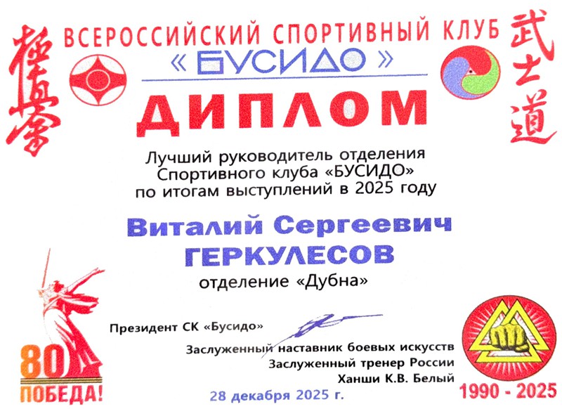 Благодарность Виталию Геркулесову (лучший руководитель отделения года, Бусидо-Дубна)