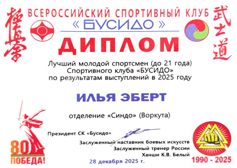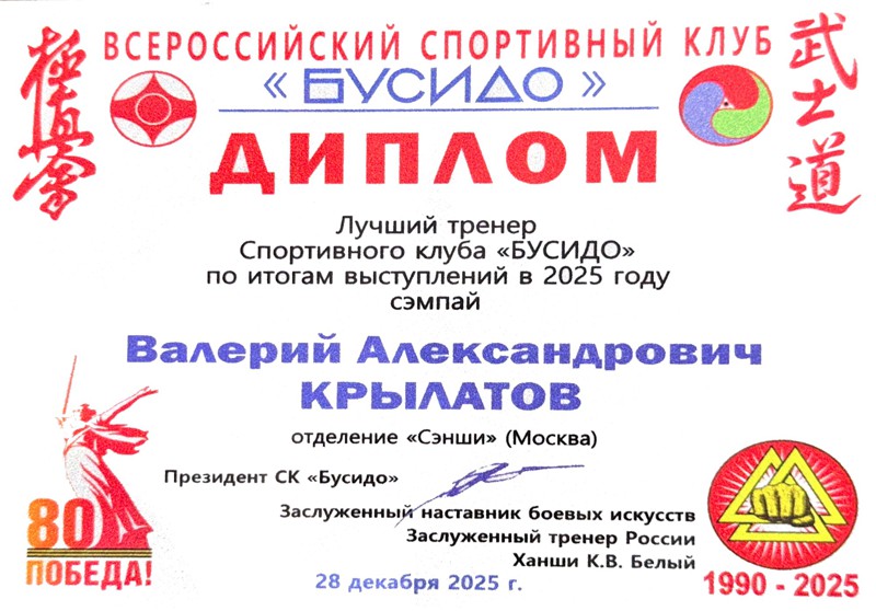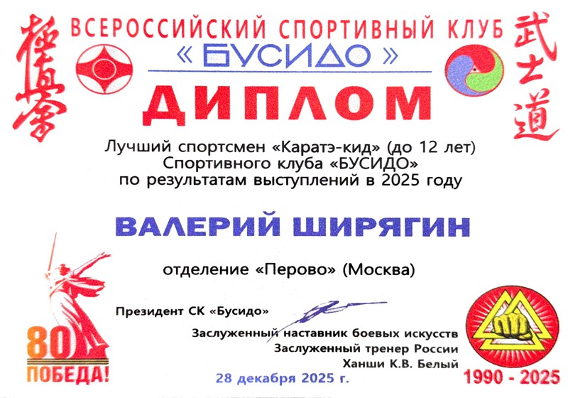 В рамках 24-го Всероссийского фестиваля киокусинкай "Юный мастер" на Кубок ДОСААФ России, прошедшего 28 декабря 2025 года в МЦБИ, состоялось награждение лучших спортсменов и тренеров клуба по итогам 2025 года и в связи с 35-летием основания клуба.