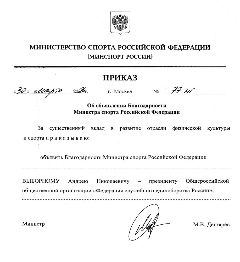 Шихану Андрею Выборному объявлена благодарность Министра спорта России |